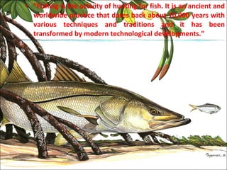 Fishing is an ancient activity dating back 10,000 years that involves catching fish using various techniques. Common fishing methods include angling using a hook and line, trolling by dragging bait behind a moving boat, casting using a rod and reel, and surfcasting from the shore. Popular fishing techniques in the Gulf of Guayaquil include using jigs, floats, sinkers, and catching fish when they strike bait. Common fish in the gulf are snook, weakfish, catfish, and pompano. Good spots for fishing include Chongón, Carrizal, and Bajen. Fishing strategies depend on location, like using strong line when fishing from docks or using live bait