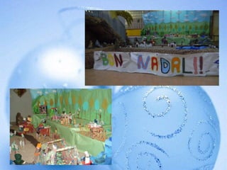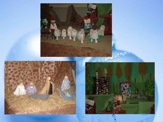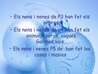 Pesebre 1. El PESEBRE Aquest curs hem celebrat el Nadal creant un pessebre molt i mol bonic. L’hem fet amb tot tipus de materials. Els nens/es d’infantil han utilitzat les culleres d’en Joan Petit i d’altres materials( taps, palles, pintura, paper, purpurina,plomes...) 2. Els nens i nenes de P3 han fet els arbres. Els nens i nenes de p4 han fet els animals: porcs, vaques, Gallines,xais... Els nens i nenes P5 de han fet les cases i masies . 3. 4. 5. 6. 7. 8. 9.