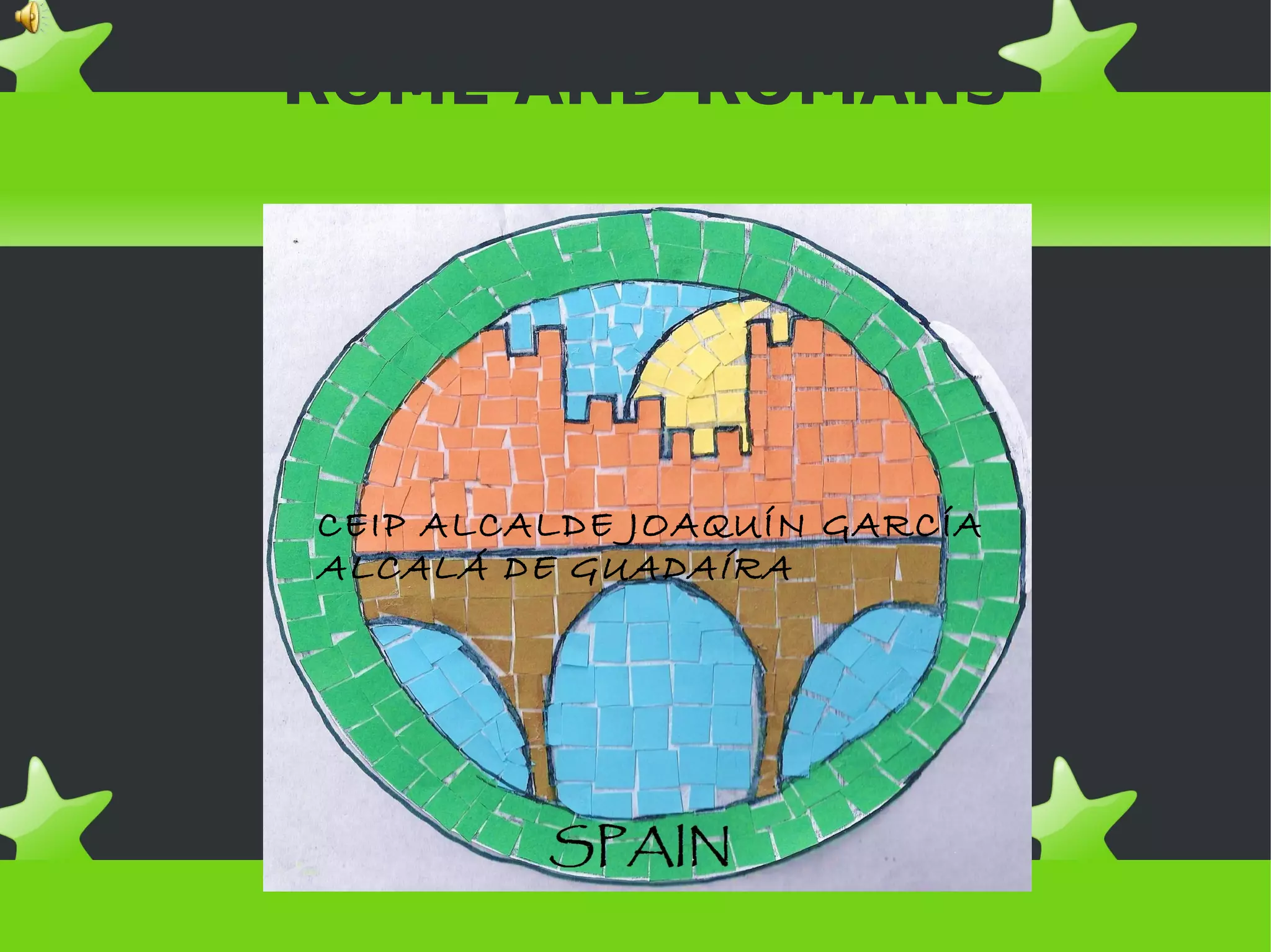 The students at CEIP ALCALDE JOAQUÍN GARCÍA have been studying Rome and Romans. They have done many activities to learn about daily Roman life, including participating in a recreation of Roman children's games, studying the Roman calendar and army, drawing Roman soldier activities, and visiting two Roman settlements in Spain. The document also describes what Roman social classes were like, with rich patricians living in villas and poor plebeians in flats. Romans enjoyed leisure activities like gladiator fights and horse races, and children played with toys like rings and ropes. Mosaics were also discussed as something Romans created for floors and walls.