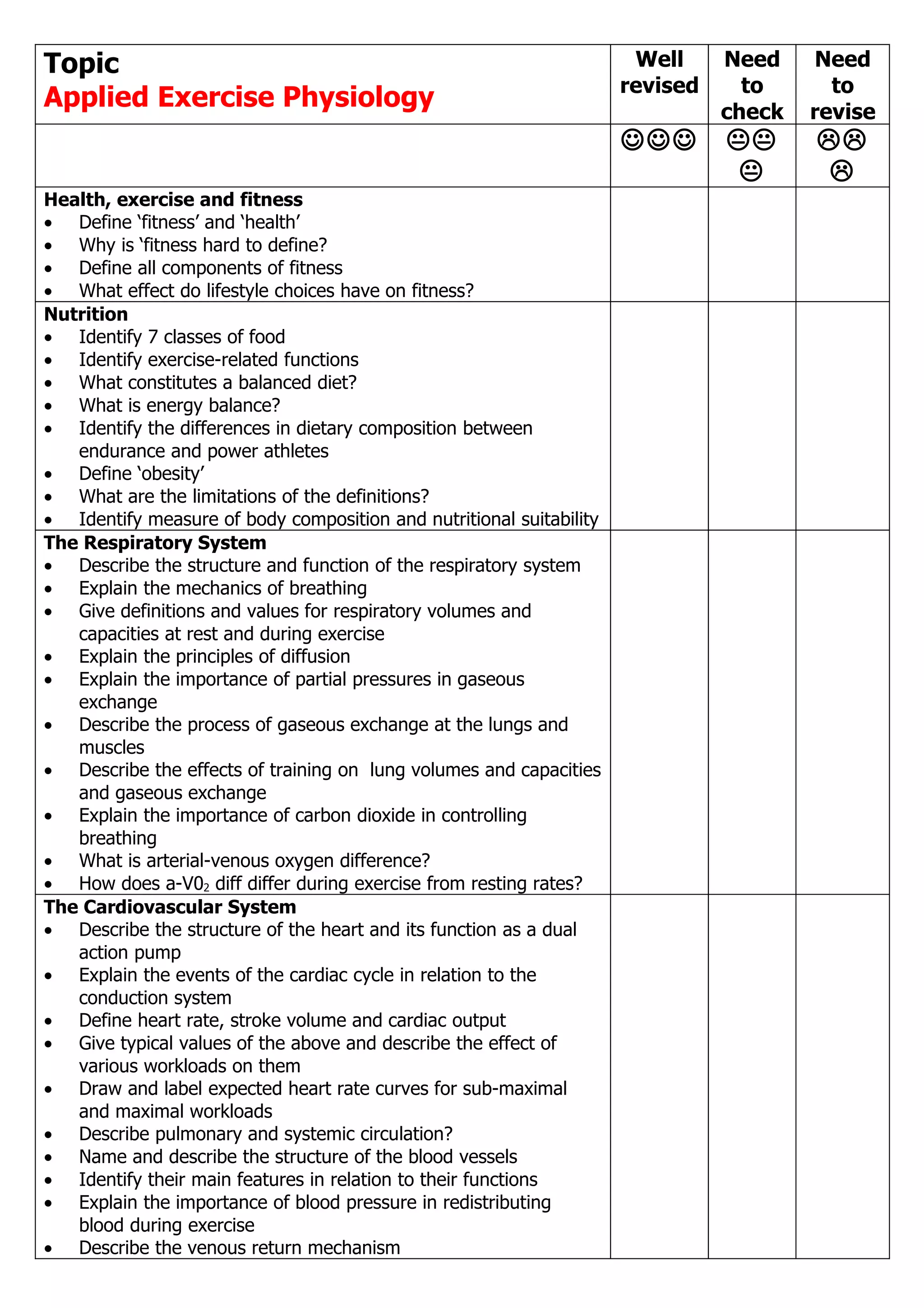 This document contains an outline for the topics, content, and learning objectives of an applied exercise physiology course. It includes sections on health, exercise and fitness; nutrition; the respiratory system; the cardiovascular system; joints muscles and mechanics; skill acquisition; opportunities for participation; and current administration and provision for active leisure. The document lists key definitions, concepts, and principles to be understood for each topic. It also identifies areas within each topic that need to be revised, checked, or had additional content added.
