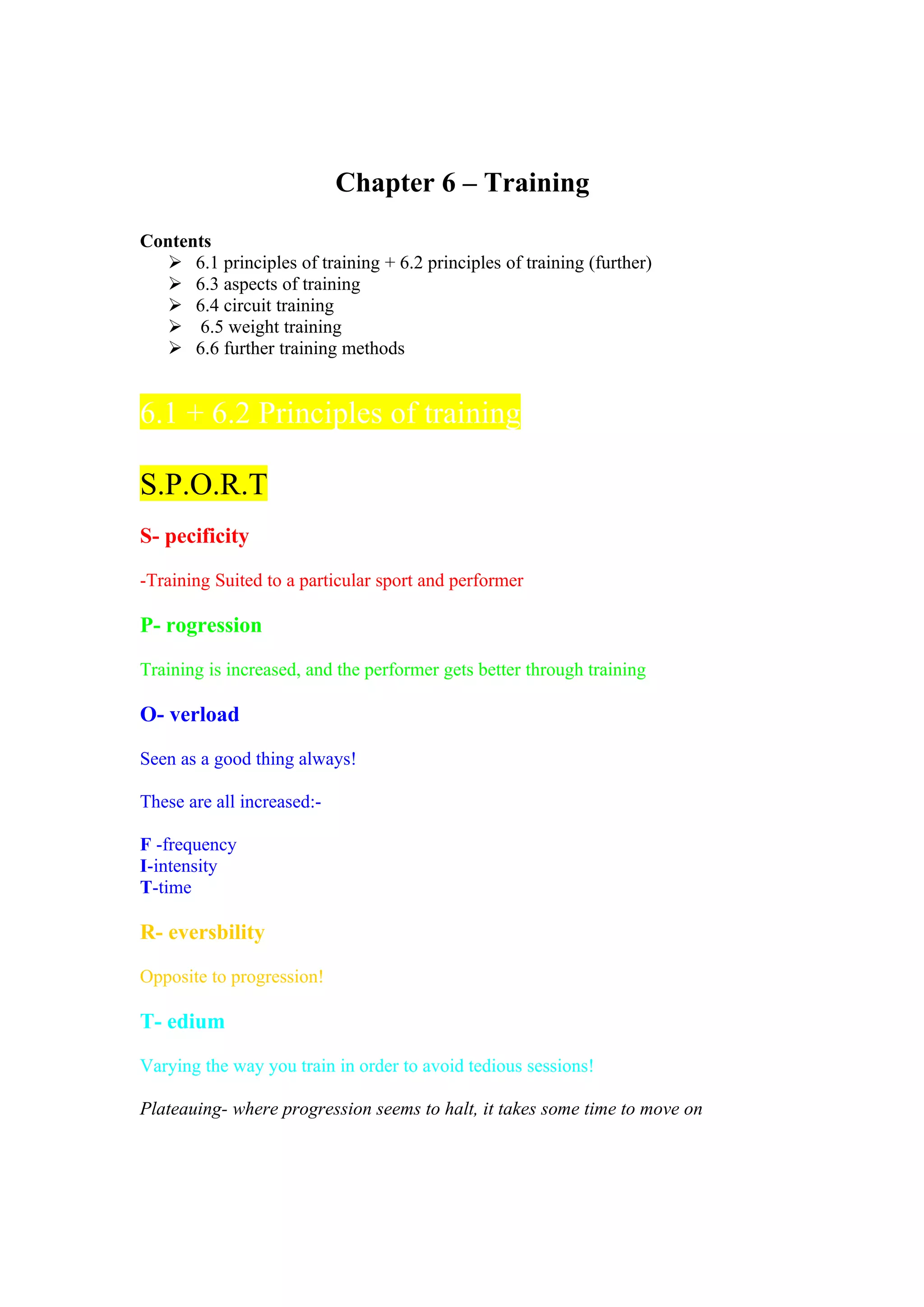 This document summarizes different training methods and principles. It discusses the SPORT principles of training - specificity, progression, overload, and reversibility. It also describes aspects of training like warm ups, fitness phases, skills phases, and warm downs. Additionally, it outlines different training types like circuit training, weight training, continuous training, interval training, and fartlek training.
