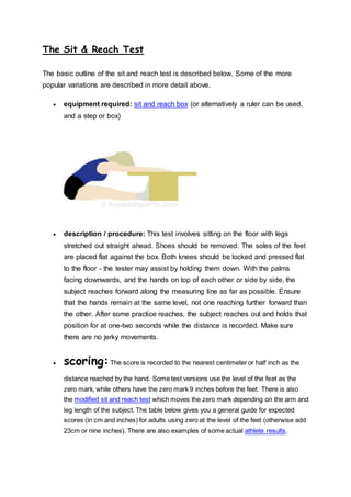 The basic outline of the sit and reach test is described below. Some of the more