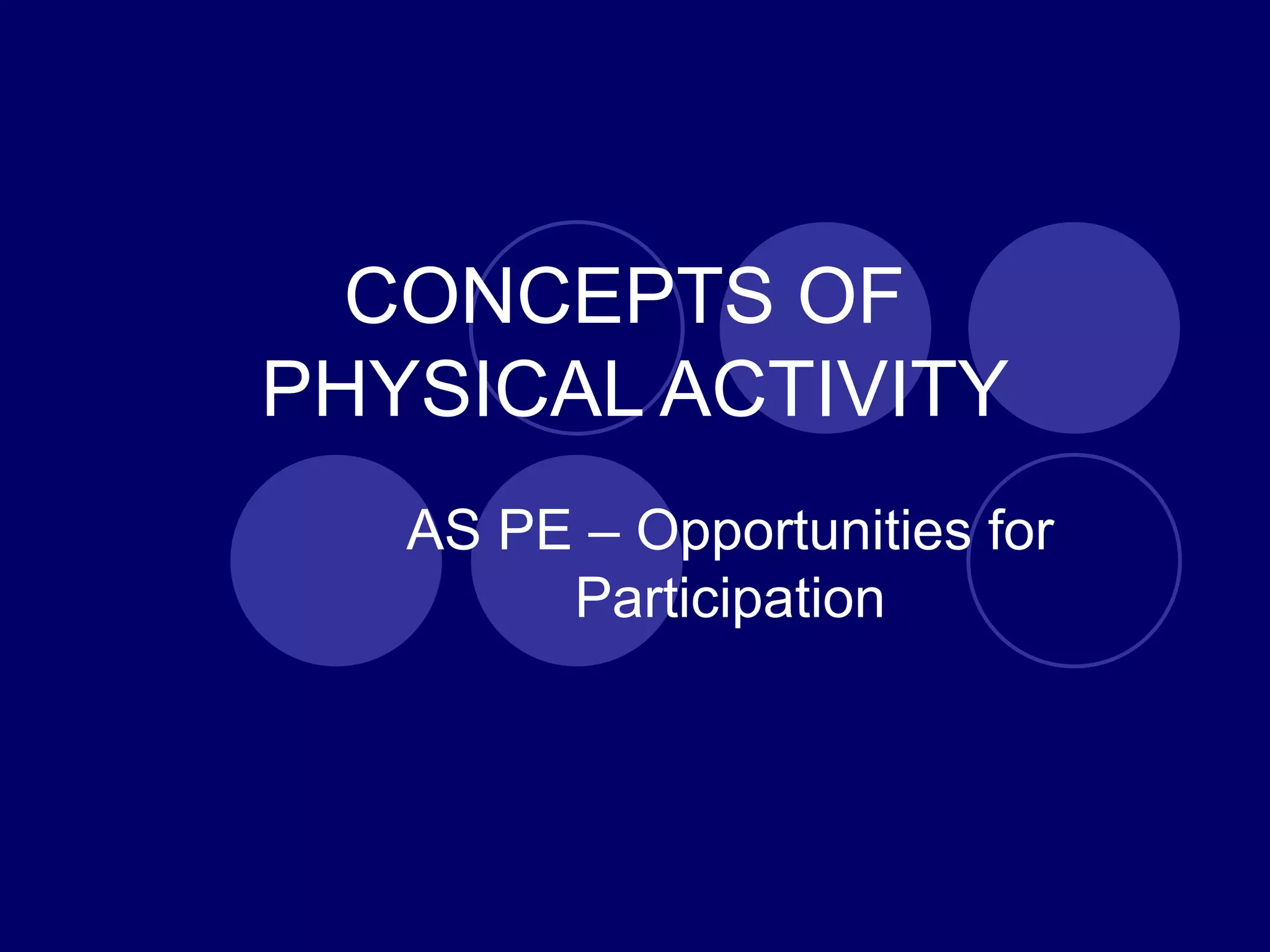 This document discusses key concepts related to physical activity, including play, leisure, recreation, outdoor activities, sport, and physical education. It explores where different activities fall on a continuum from least to most organized and competitive, and provides definitions and benefits of each concept. The goal is to help the reader understand these important concepts and how they relate to one another.