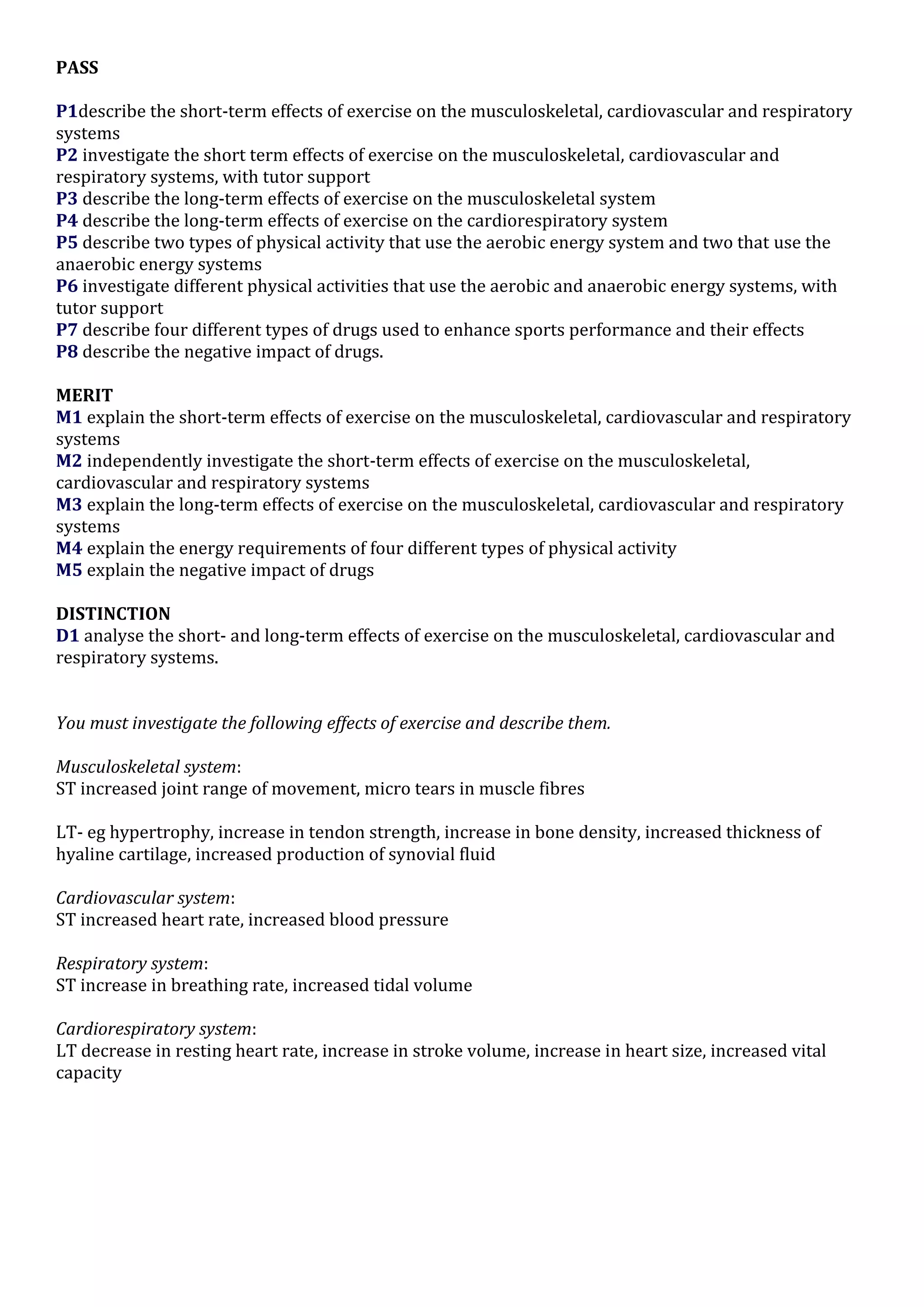 This document outlines the learning objectives and content for a unit on the effects of exercise on the body's systems. It describes both the short-term and long-term impacts of exercise on the musculoskeletal, cardiovascular and respiratory systems. Specifically, it addresses how exercise acutely affects heart rate, breathing, and muscle fibers, while chronic exercise leads to increased bone and muscle strength over time. It also discusses the energy systems used in different physical activities and sports, as well as the performance-enhancing drugs used illegally and their health risks.