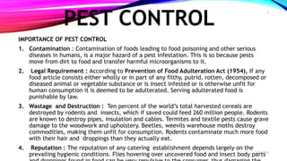 Pests like insects, rodents and birds can contaminate food and spread diseases if not properly controlled. Effective pest control requires maintaining good sanitation practices, using chemical treatments appropriately, and preventing pest entry and breeding. Key pests in catering establishments include houseflies, cockroaches, rats and mice. Controlling these pests involves removing their food and shelter sources, using baits and traps, sealing cracks and openings, and applying approved insecticides in problem areas. Ongoing pest prevention through sanitation is crucial to avoid contamination and legal issues.