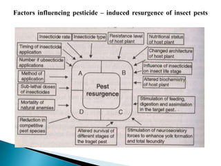 This document discusses pest resurgence, defined as a rapid reappearance or increase in pest populations after insecticide application that kills natural enemies. It notes a historical example of brown plant hopper resurgence in rice fields. The document outlines causes of resurgence like suppressing natural enemies and secondary pest outbreaks. It identifies two main types of resurgence and discusses strategies to manage resurgence like avoiding natural enemy destruction and using selective control measures.