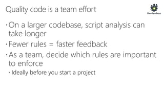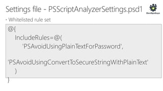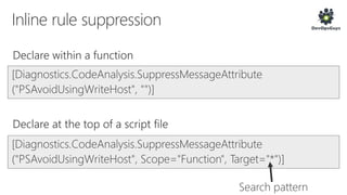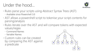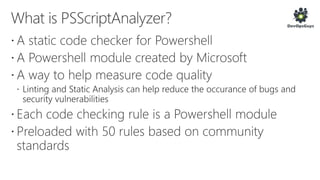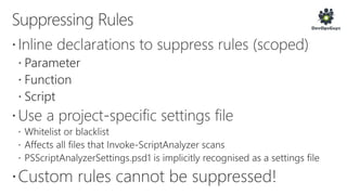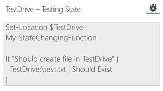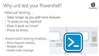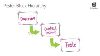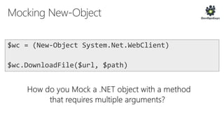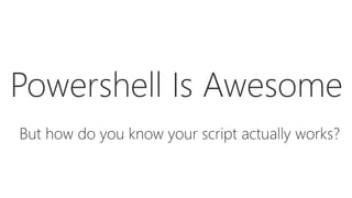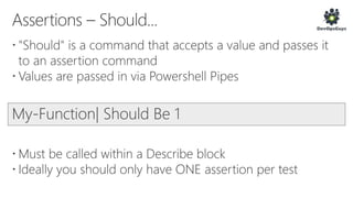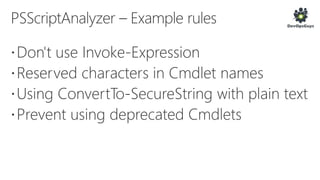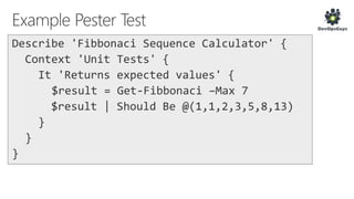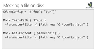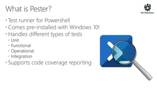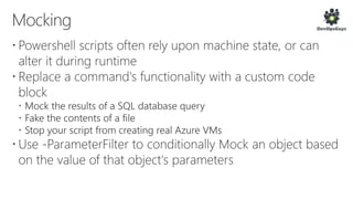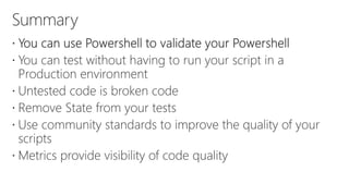 The document outlines a PowerShell testing framework utilizing Pester for unit and functional tests, detailing commands for executing tests and analyzing code quality. It emphasizes the importance of mocking, state isolation, and ensuring that tests validate expected outputs and exceptions properly. Additionally, it provides links to relevant GitHub repositories and blog resources for further exploration of PowerShell testing practices.