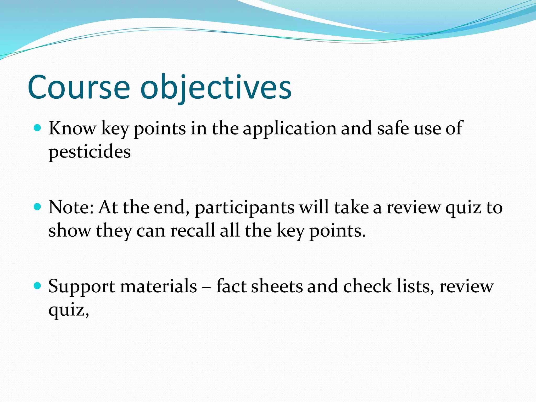 This document provides an overview of pesticide safety for a training course. It discusses key topics like reading pesticide labels, understanding active ingredients and signal words, proper use of protective equipment, safe practices for mixing, applying, storing and disposing of pesticides. Safety hazards like exposure, spills and first aid procedures are explained. The goal is for participants to understand how to safely and properly use pesticides by recalling the important points covered.