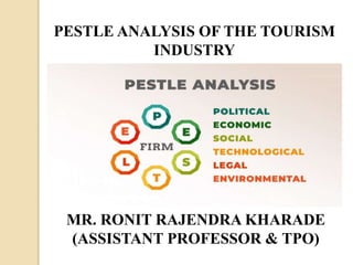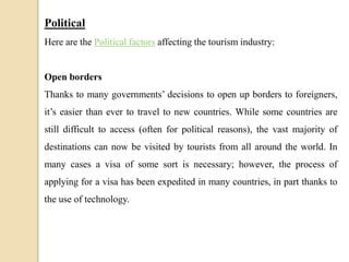 The document discusses the PESTLE factors affecting the tourism industry. Politically, open borders and government stability help tourism but political instability can hurt destinations. Tax incentives provide additional incentives for tourists. Economically, rising incomes increase discretionary spending on travel while the sharing economy impacts traditional providers. Socioculturally, social pressures and increased racial acceptance help tourism. Technologically, improved transportation is more accessible and affordable. Environmentally, transportation pollution and tourist negligence create challenges.