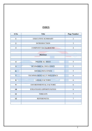 This document provides a PESTLE analysis for Citibank. It begins with an executive summary of Citibank's history and operations, including that it has over 200 million customer accounts in 140+ countries. The document then covers the political, economic, social, technological, legal, and environmental factors affecting Citibank. It analyzes opportunities such as Citibank's large customer base in growing Asian markets and threats such as economic uncertainties and government regulations. The document concludes with references.