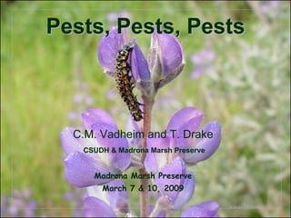 This document discusses integrated pest management strategies for gardening with native plants. It defines what a pest is from a human perspective and explains predator/prey relationships in nature. When non-native plants are grown in monocultures with excessive water and fertilizer, they are more susceptible to pests. The document recommends using native plants adapted to the local environment, planting a variety of species, and implementing cultural practices like proper watering to prevent pest problems. Integrated pest management is presented as a strategy that uses biological, cultural and chemical controls, with the least hazardous methods employed first. Specific pests like aphids, whiteflies and mealybugs that affect native plants are described along with monitoring and control recommendations.