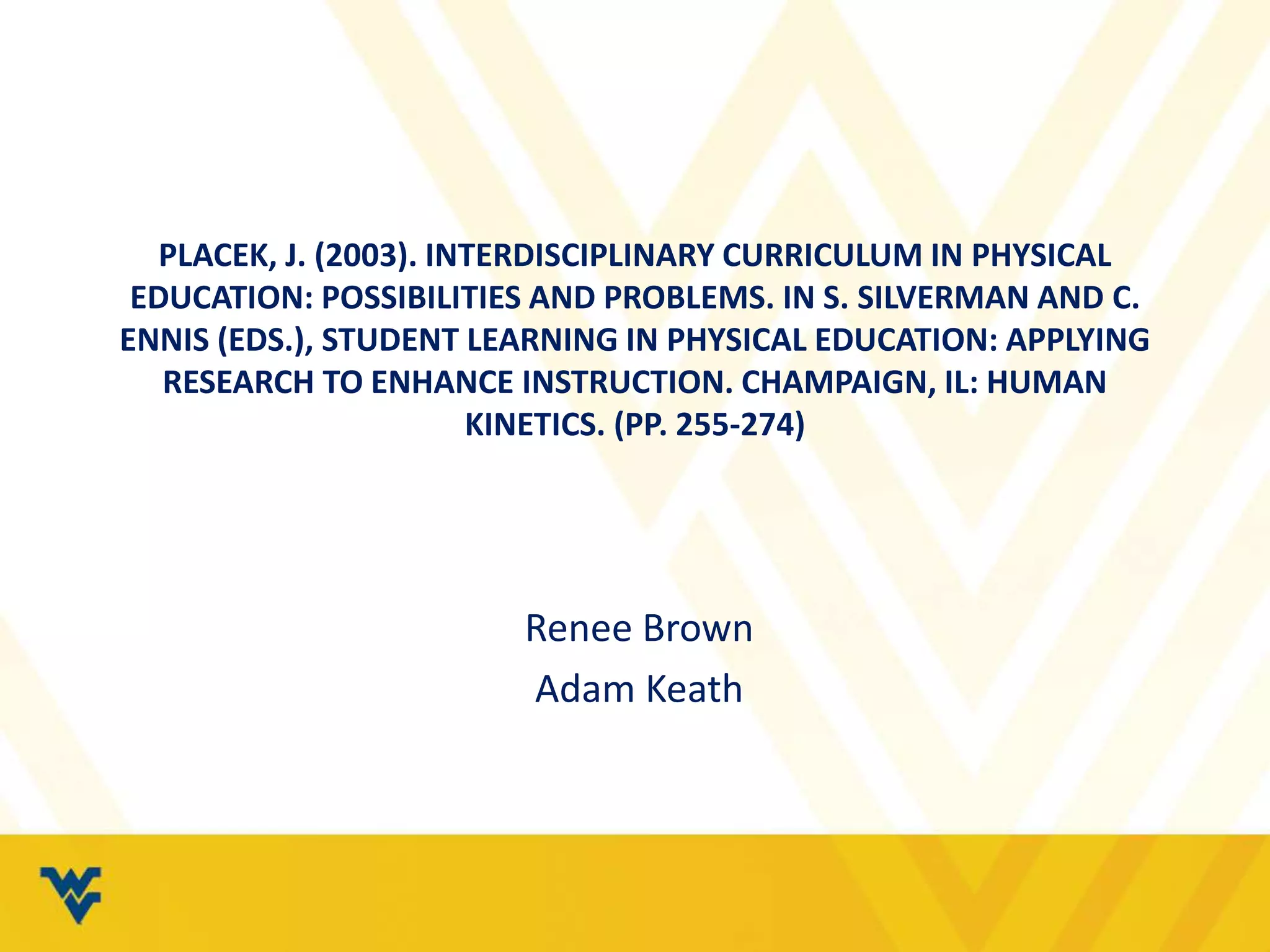 This chapter explores the possibilities and challenges of using interdisciplinary and integrated curriculums in physical education. It discusses how integration combines concepts across subject areas without boundaries, while interdisciplinary correlates activities and lessons between physical education and other subjects. The chapter reviews literature on integration dating back to the 1930s and factors influencing curriculum such as testing. It analyzes how physical education standards can intersect with other areas and provides examples of interdisciplinary models. While research supports interdisciplinary education, issues like testing standards and teacher specialization have limited its application. The chapter concludes an effective interdisciplinary curriculum makes natural connections between subjects without forcing relationships.