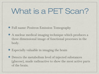 A PET scan uses radioactive tracers injected into the body to produce 3D images showing functional processes. A short-lived radioactive tracer, FDG, is injected and detected as it breaks down, showing glucose metabolism levels in tissues. Different metabolism levels appear as different colors, allowing the computer to generate images of functional abnormalities like cancers or brain disorders. PET scans can detect diseases earlier than other scans and help avoid unnecessary surgery by precisely identifying areas needing treatment.