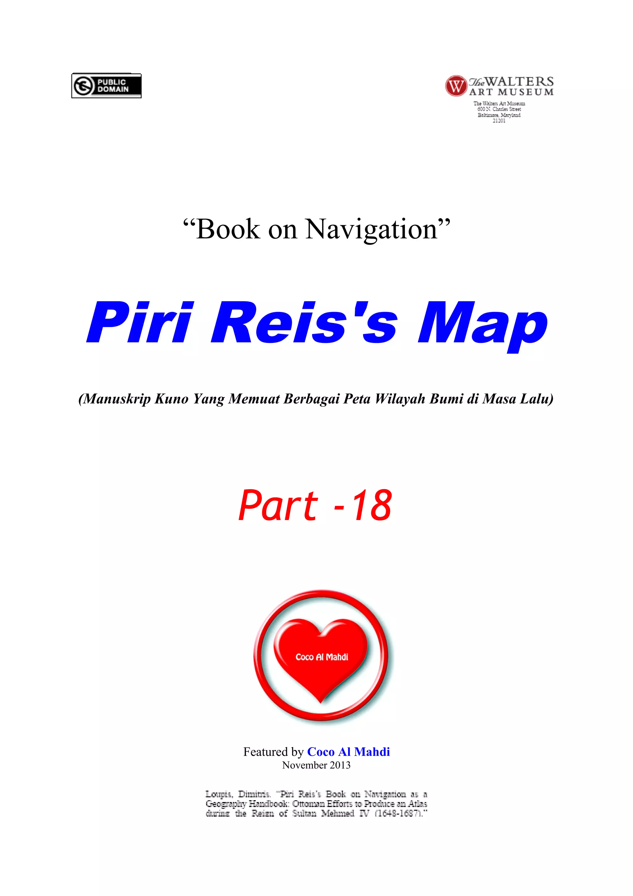 Dokumen ini membahas peta Piri Reis, sebuah manuskrip kuno yang berisi berbagai peta wilayah bumi pada masa lalu. Peta tersebut menjadi fokus dari bagian ke-18 artikel yang ditulis oleh Coco Al Mahdi. Terdapat penanda untuk melanjutkan ke bagian ke-19.