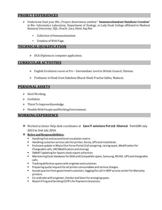 This resume is for Petchiammal.A, who has over 10 years of experience in customer service, sales, and business administration. She has a Bachelor's degree in Zoology with a specialization in biotechnology. Her objective is to work in a competitive environment and contribute value to the company. She has held positions as a senior help desk coordinator, service coordinator, help desk coordinator, sales executive, and marketing executive. Her experiences include customer support, order processing, database management, and business development.