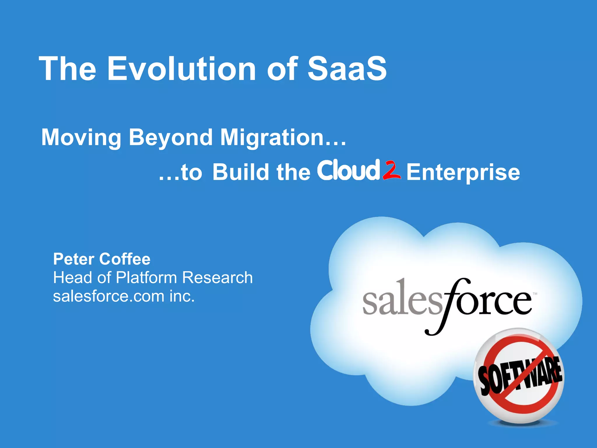 The document discusses the evolution of Software as a Service (SaaS) and its implications for enterprises, highlighting the competitive disadvantages businesses may face if they do not adopt a SaaS migration strategy. It emphasizes the benefits of cloud computing, including lower costs, improved efficiency, and enhanced security, while addressing common misconceptions about the technology. Additionally, it showcases various successful case studies and the potential for value creation through cloud-based applications and services.