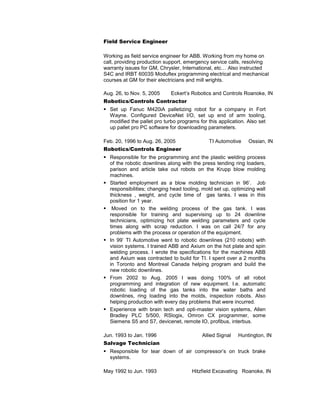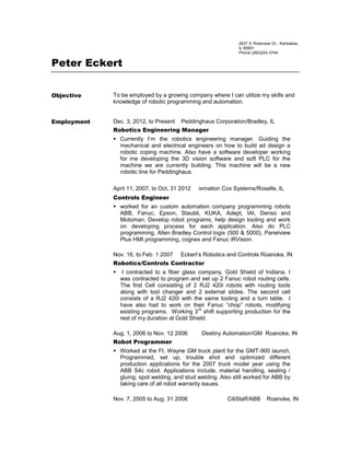 Peter Eckert has over 25 years of experience in robotics programming and automation engineering, currently serving as Robotics Engineering Manager at Peddinghaus Corporation. His background includes extensive experience programming various robot models from manufacturers like ABB, Fanuc, and KUKA across several industries. He is seeking a new position to utilize his skills in robotics programming and automation at a growing company.