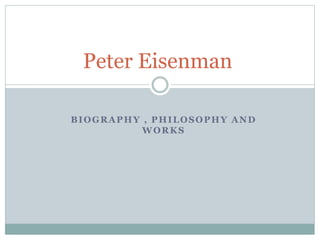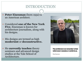 Peter Eisenman is an American architect known for deconstructivist designs. He received various degrees including from Cornell, Columbia, and Cambridge. Eisenman helped found the Institute for Architecture and Urban Studies. Some of his most notable works include the Memorial to the Murdered Jews of Europe in Berlin, the Wexner Center for the Arts at Ohio State University, and House VI in Cornwall, Connecticut. Eisenman's designs are characterized by manipulating structural elements and contradicting traditional architectural concepts in order to question norms.