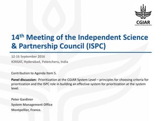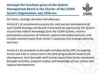 The document discusses prioritization at the CGIAR system level. It notes that the System Management Board and System Management Office have functions related to strategy, financial performance, and prioritization in the CGIAR charter. It raises questions about how to approach prioritization across CRPs and over time. Key criteria for prioritizing investments are proposed to include strategic alignment, time to results, risk, cost, complexity, and project performance. The roles and processes for portfolio-level prioritization are also discussed.