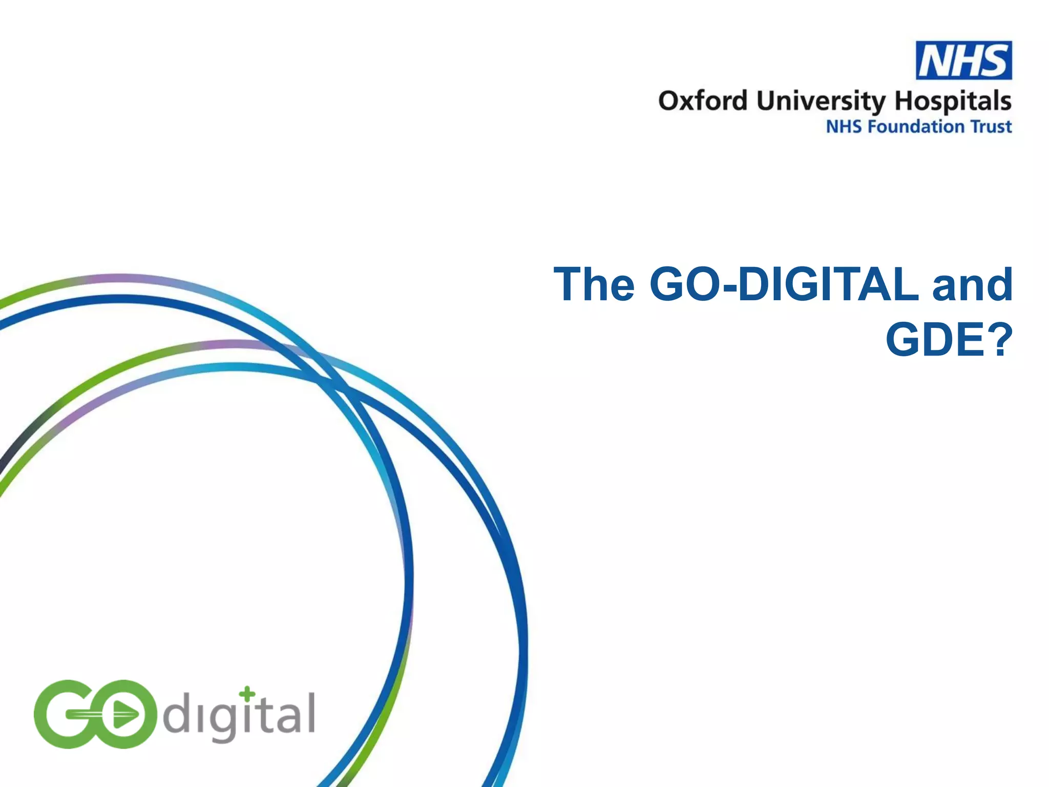 This document discusses the GO-DIGITAL and GDE initiatives at a large NHS trust located across 4 sites. It provides context about the trust, including annual patient contacts and services provided. It outlines that the trust has been using Cerner since 2011. The transformation and GDE plan to leverage electronic health records, data, and technology to innovate and connect patient care across organizations is described. A timeline for Years 1-5 and Years 5-10 is presented, outlining goals and initiatives around decision making, EPR modules, the longitudinal record, clinical dashboards, population records, remote services, and self-care/monitoring. Metrics for judging the results are proposed, focused on cost reductions from less duplicate data entry and