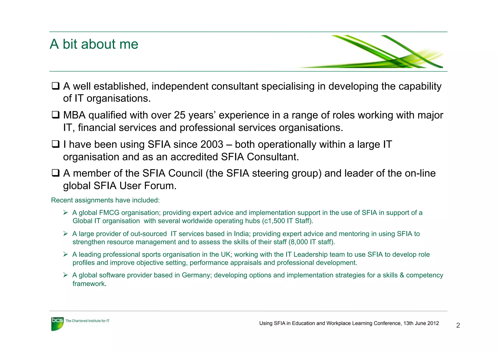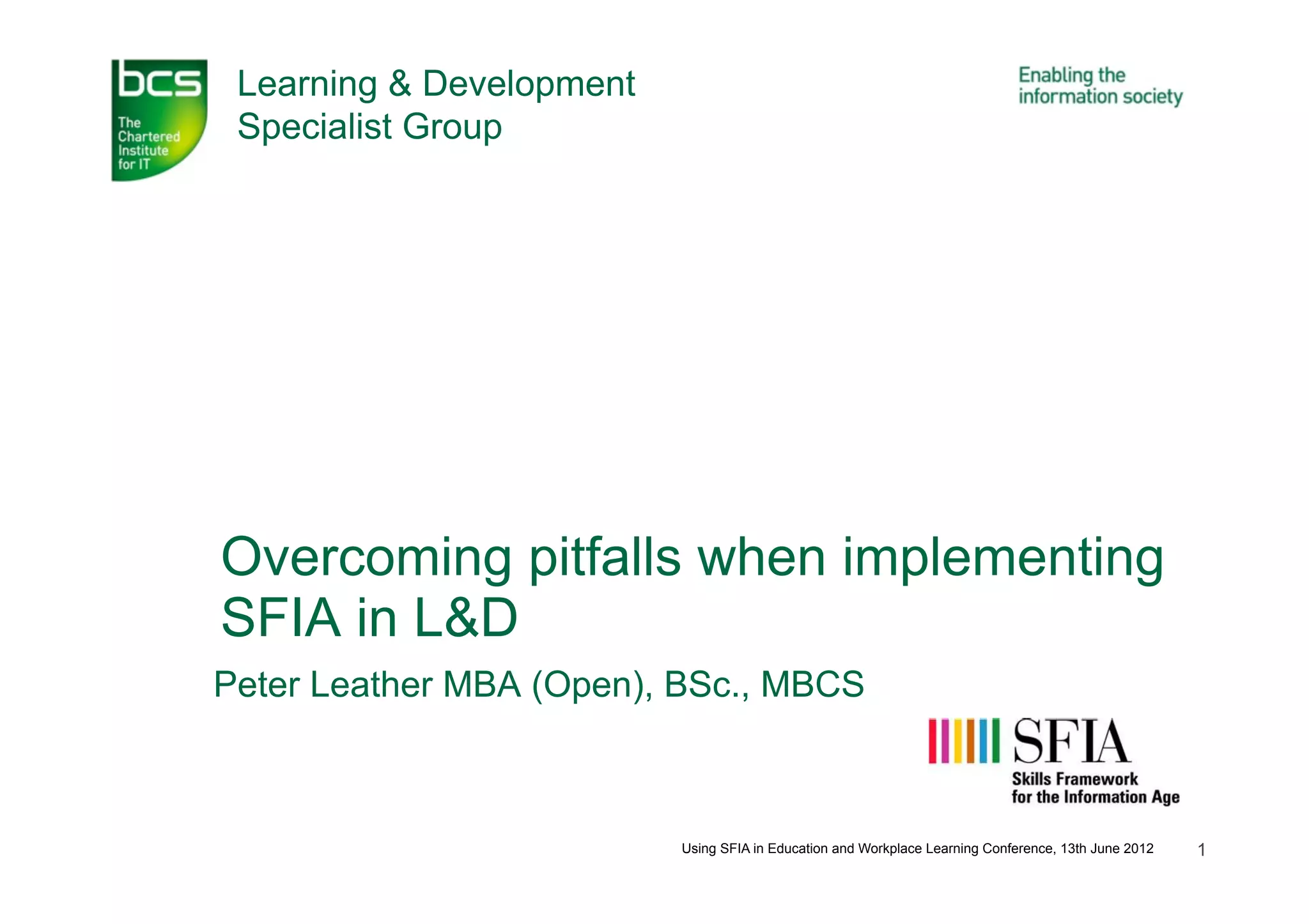 1) Peter Leather is an independent consultant specializing in developing IT organizational capabilities. He has over 25 years of experience working with major organizations and has been using SFIA since 2003.
