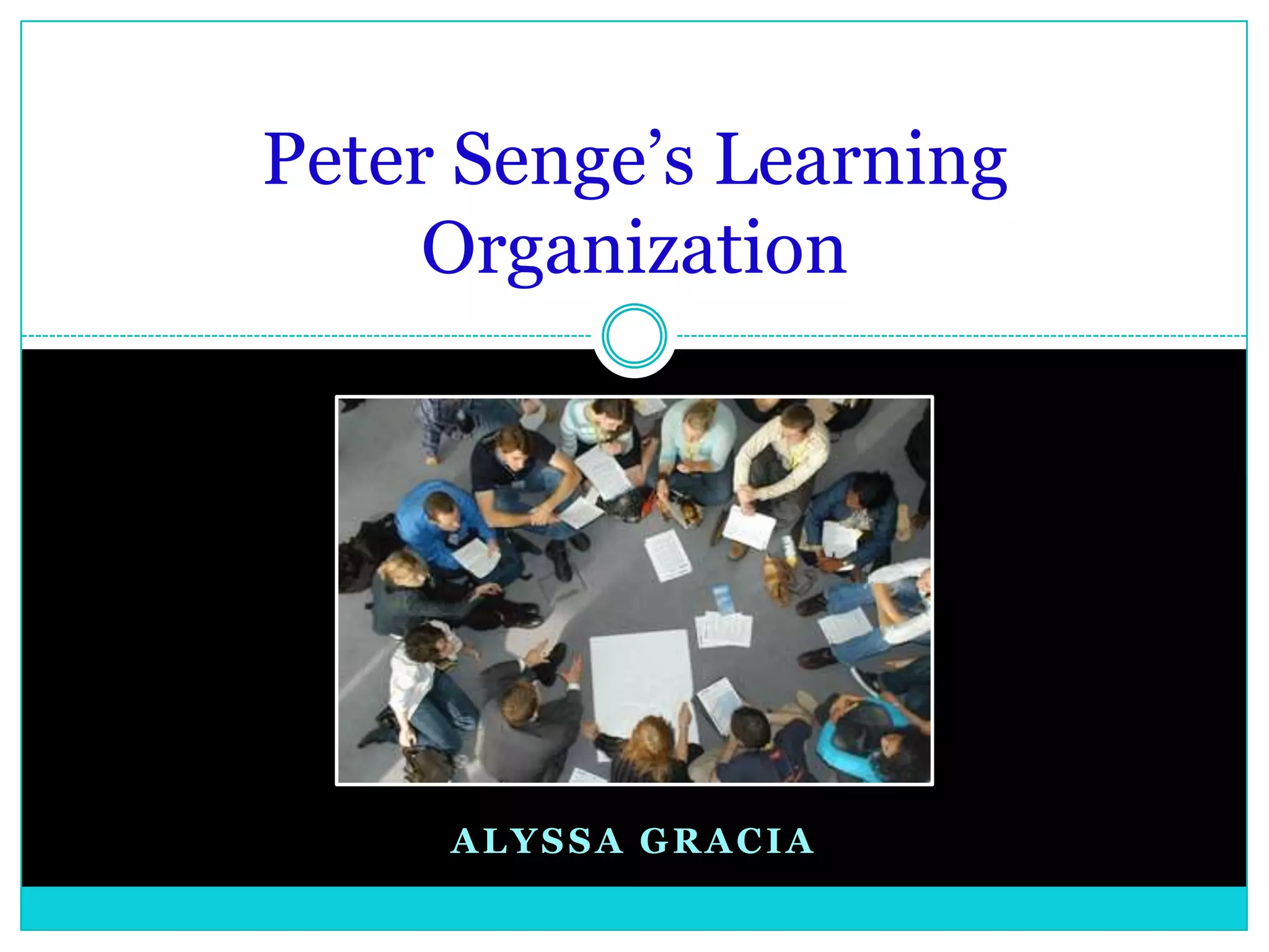 The document discusses Peter Senge's concept of learning organizations, which foster continuous personal and collective learning to achieve desired outcomes. It identifies five basic disciplines necessary for such organizations: personal mastery, mental models, shared vision, team learning, and systems thinking, and evaluates their application through a series of assessments with mixed results. The overall challenges include lack of participation, structure, and time constraints within specific geographical areas.