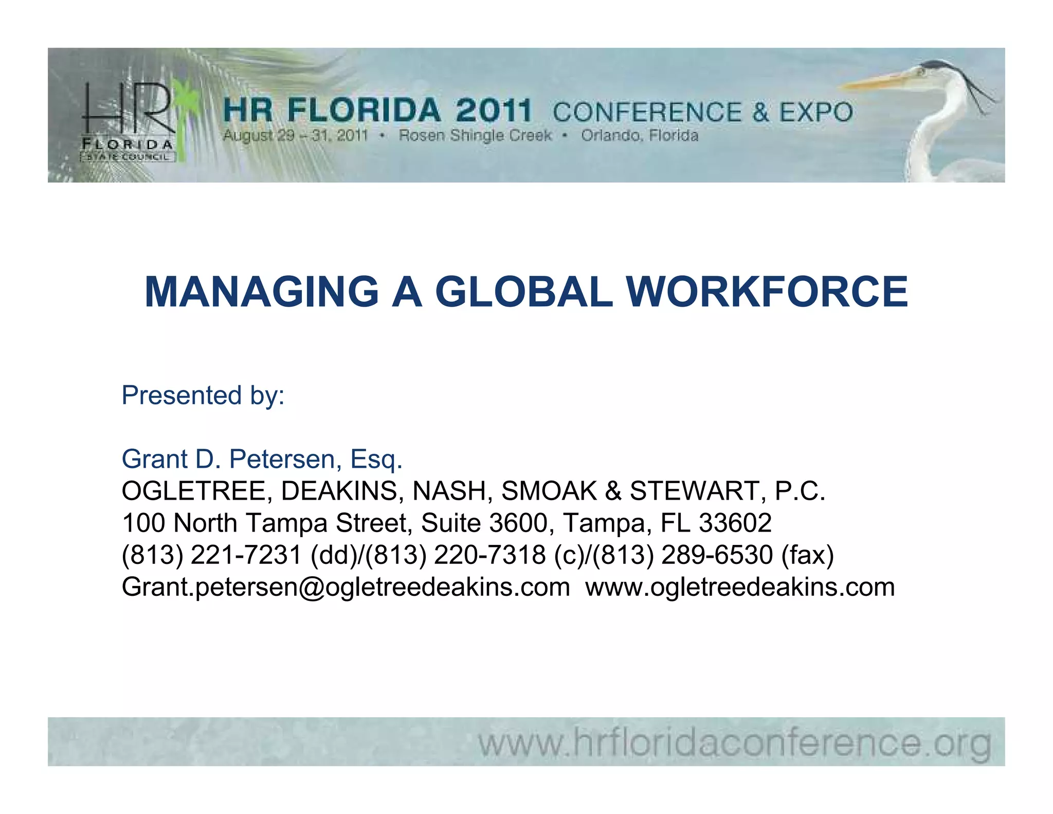 This document summarizes challenges and considerations for managing a global workforce. It discusses issues that arose for a Brazil sales representative, offshore business moved to China, an expatriate assignment in Germany, and implementing global HR policies. Key topics covered include employment classification, severance, discrimination laws, data privacy, works councils, and compliance programs.