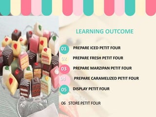 This document provides instructions for preparing different types of petit fours. It defines petit fours as small pastries that can be eaten in one or two bites. The document then details how to prepare iced petit fours with cake, jam, buttercream and fondant glaze. It also explains how to make fresh petit fours using mini pastries filled with cream or fruit. Finally, it discusses caramelizing nuts and dried fruits to make petit fours and the proper storage methods to maintain freshness.