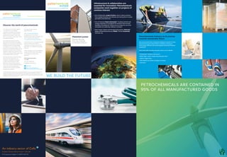 Petrochemicals are contained in 95% of manufactured goods and are essential materials for a sustainable future. The document is a flowchart that traces the path from raw materials like crude oil, natural gas, and bio-naphtha to everyday petrochemical products and their uses. It shows the production processes like steam cracking, catalytic reforming, and processing to produce materials like ethylene, propylene, and aromatics. These are then used to make derivatives and end products for applications like automotive, packaging, construction, and more. The petrochemical industry is working towards more sustainable production through projects involving carbon capture and storage.