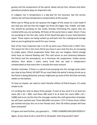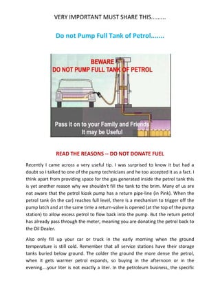 The document provides tips for filling up your vehicle's gas tank efficiently and avoiding being overcharged. It recommends not filling the tank all the way to avoid triggering the pump's return mechanism that sends excess gas back to the station without being measured. It also suggests filling up in the morning when the ground and gas are colder, as the gas is more dense and you get the full amount. The document encourages slowly pumping gas on low speed to minimize vapor return and only filling up when the tank is around half full to displace less gas with air.