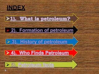 Petroleum is a non-renewable energy source formed from the remains of ancient organisms over millions of years. Geologists and geophysicists use their knowledge of rocks and earth science to locate potential underground petroleum deposits. Once extracted, crude oil is refined into useful petroleum products like gasoline, diesel, and jet fuel as well as many other products people use every day.