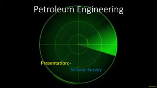 The document provides information about a presentation on seismic surveys given by Rakesh Kumar. It lists the group members and discusses topics including the origin of oil and gas from plankton and cooking of organic matter, oil migration and traps, reservoir rocks, and seismic surveys. Seismic surveying involves firing sound waves into the earth and analyzing the reflected waves to image rock formations and determine potential locations for oil and gas reservoirs.