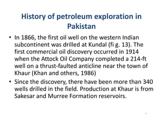 The document provides a comprehensive overview of petroleum geology in the Upper Indus Basin of Pakistan, detailing the history of oil exploration and discovery, major fields, and their characteristics. It highlights significant oil and gas fields such as Joyamir, Meyal, Khaur, and Adhi, along with their geological formations, source rocks, and production histories. Additionally, it discusses the geological classification of basins, hydrocarbon potential, and the structural features relevant to petroleum accumulation.