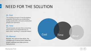 The document discusses using unmanned aerial vehicles (UAVs) to provide pipeline inspection services as an alternative to traditional manual inspections which are expensive, time-consuming, and prone to errors. It introduces a UAV product called "The Willow" that can autonomously capture high-resolution images and data during various stages of pipeline development and send it to the cloud for processing and generating reports. Key advantages of this UAV solution include experience executing similar projects, an integrated platform for professional services, and using cutting-edge technologies for data collection and analysis.