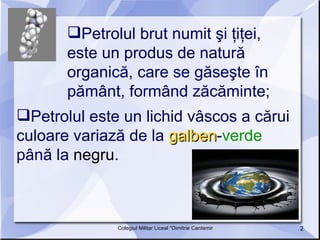 Petrolul, cunoscut și sub denumirea de țiței, este un produs organic găsit în zăcăminte subterane, provenind din organisme marine dispărute. Extracția acestuia se face prin metode precum cariere de suprafață, sonde sau platforme de foraj, iar procesul de prelucrare include îndepărtarea gazelor de sondă și distilarea fracțională. Rafinarea petrolului implică atât extracția substanțelor nedorite, cât și procedeuri chimice pentru îmbunătățirea calității produselor petroliere.