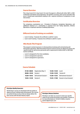 Petrosync offers a certification series for well intervention pressure control accredited by IWCF, with programs available for different competency levels (2, 3, and 4). Each course includes multiple examinations essential for certification, and the certificates are valid for varying periods depending on the level. The program is tailored for personnel in critical positions and can be customized to meet specific training needs.