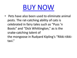 Pets have been used to eliminate pests like rats and snakes. Pets have also become a self-perpetuating industry through breeding for various purposes like showing or racing. Horses and cats are two of the animals most closely associated with humans, though both were domesticated relatively late in history, with horses used in chariot battles by 2000 BCE and cats becoming domesticated in Egypt around the 16th century BCE.