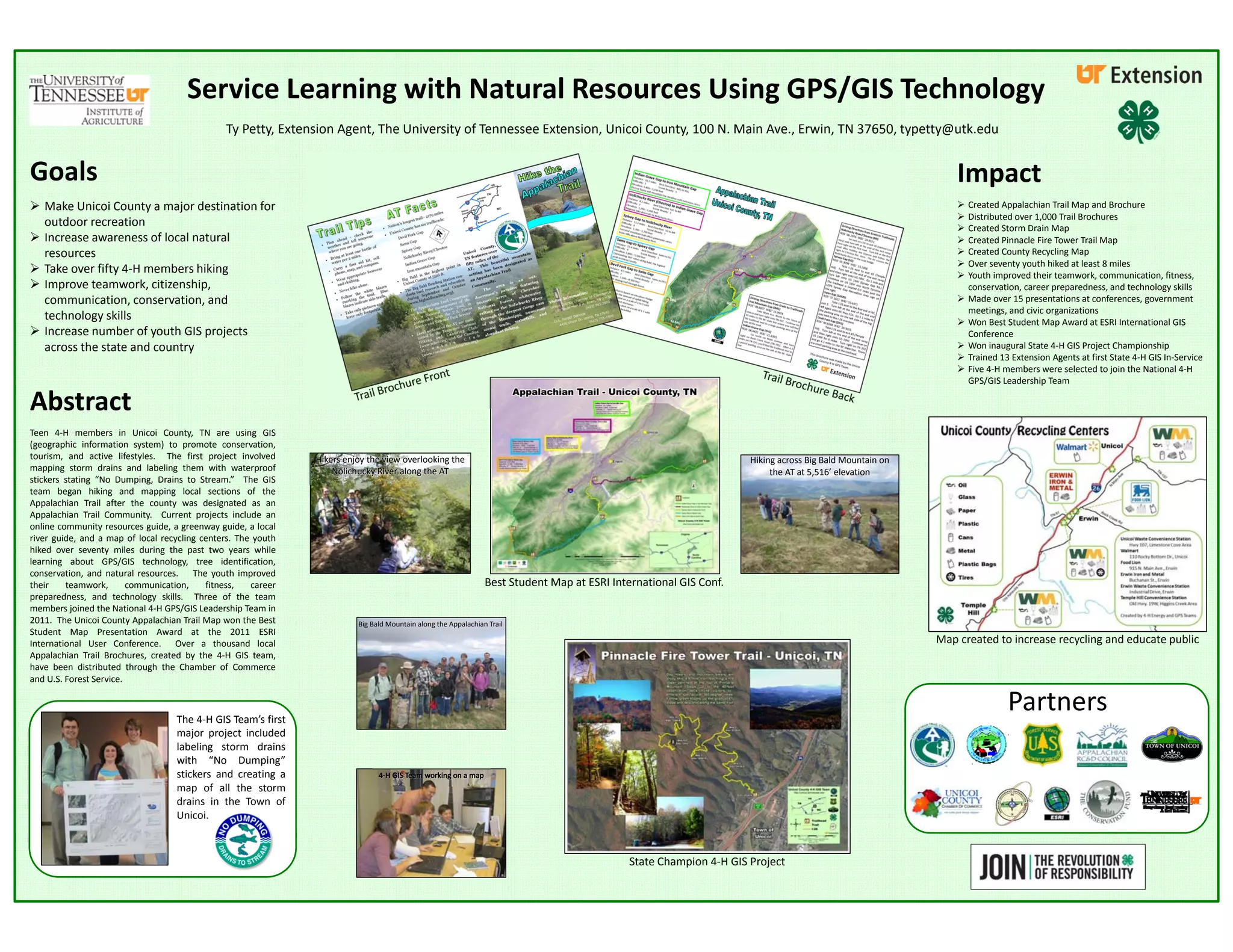 Teen 4-H members in Unicoi County, TN are using GPS and GIS technology to map local natural resources and increase outdoor recreation in the area. Their projects include mapping sections of the Appalachian Trail, storm drains, and recycling centers. Through these projects, over 70 youth have hiked over 8 miles while improving skills in teamwork, communication, conservation, and technology. Their maps have won awards and been presented at conferences, and have helped promote the county as an outdoor destination.