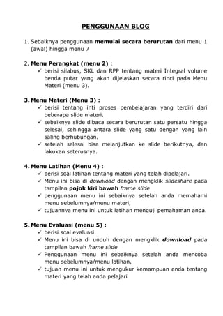 Dokumen ini menjelaskan berbagai menu dalam penggunaan blog untuk pembelajaran matematika, termasuk menu beranda, perangkat, materi, latihan, evaluasi, remedial, pengayaan, diskusi, dan resume. Setiap menu memiliki tujuan spesifik dan panduan penggunaan yang disarankan untuk meningkatkan pemahaman siswa terhadap materi. Struktur penggunaan menu diatur agar siswa dapat belajar secara berurutan dan menguji kemampuan mereka.