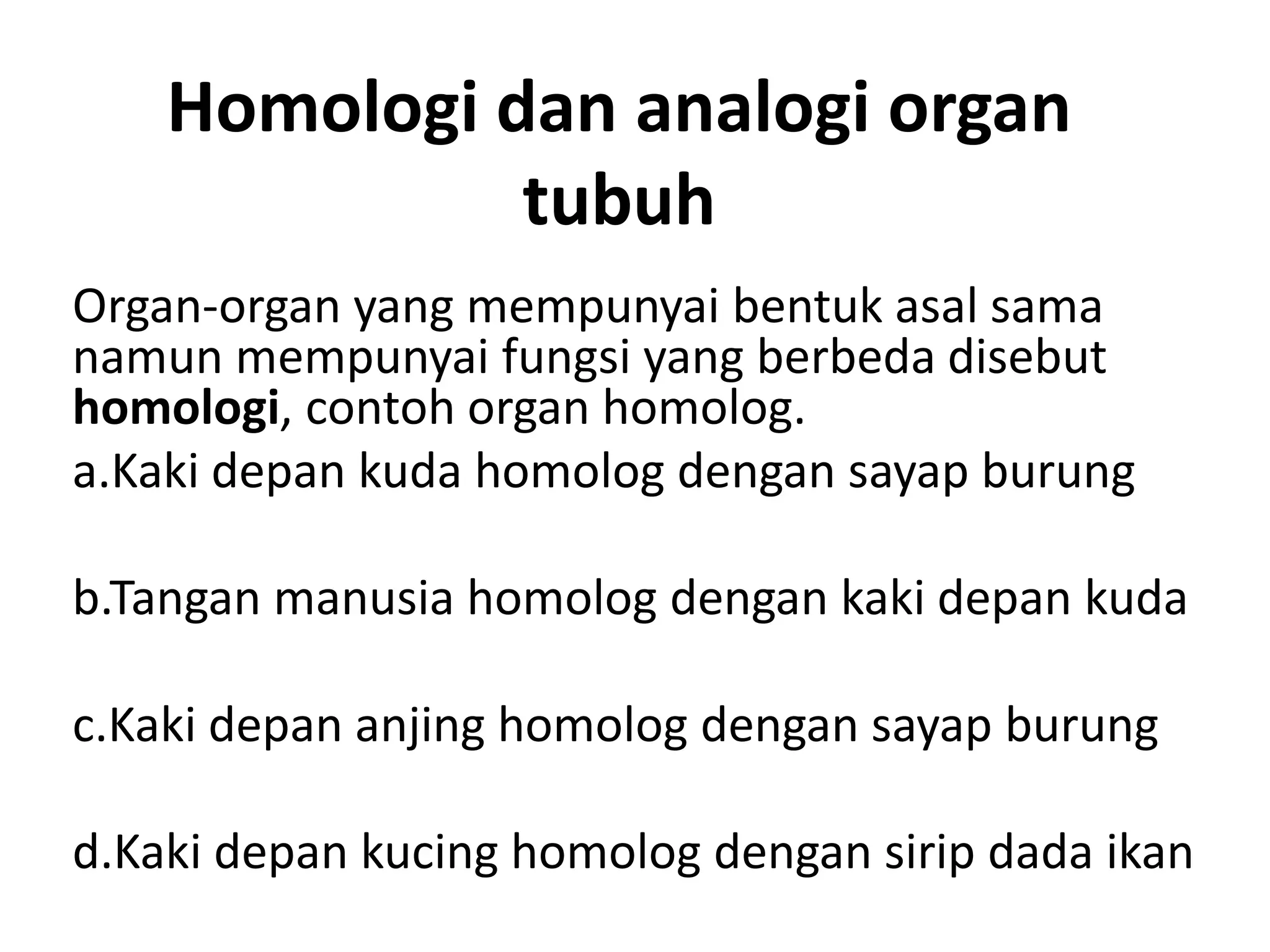 Dokumen ini membahas perbedaan antara organ homolog dan analog, serta memberikan contoh spesifik untuk masing-masing. Selain itu, dokumen juga mencakup evolusi manusia dan kuda, serta pentingnya fosil dalam memahami evolusi. Terdapat penjelasan tentang hominid awal dan urutan evolusi manusia serta batang perkembangan kuda dari fosil.