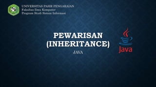Dokumen ini menjelaskan konsep pewarisan (inheritance) dalam pemrograman Java, di mana suatu kelas (superclass) dapat mewariskan sifat kepada kelas turunannya (subclass). Pewarisan memungkinkan penggunaan kembali kode dan efisiensi dalam manajemen data, serta memberikan kontrol akses terhadap data dan metode yang diwariskan. Beberapa contoh dan penggunaan kata kunci seperti 'extends' dan 'super' juga disertakan untuk memperjelas penerapan konsep ini.