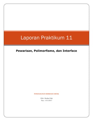 Dokumen ini menjelaskan konsep pemrograman berbasis objek dengan fokus pada pewarisan, polimorfisme, dan interface melalui laporan praktikum. Contoh yang diberikan mencakup kelas induk 'person' dan subclass 'student' serta 'employee', serta penggunaan kelas abstract dan interface untuk mendemonstrasikan bagaimana atribut dan metode dapat diakses dan dimodifikasi. Setiap percobaan menunjukkan implementasi dari konsep-konsep tersebut dalam bentuk kode dan hasil tampilan masing-masing.