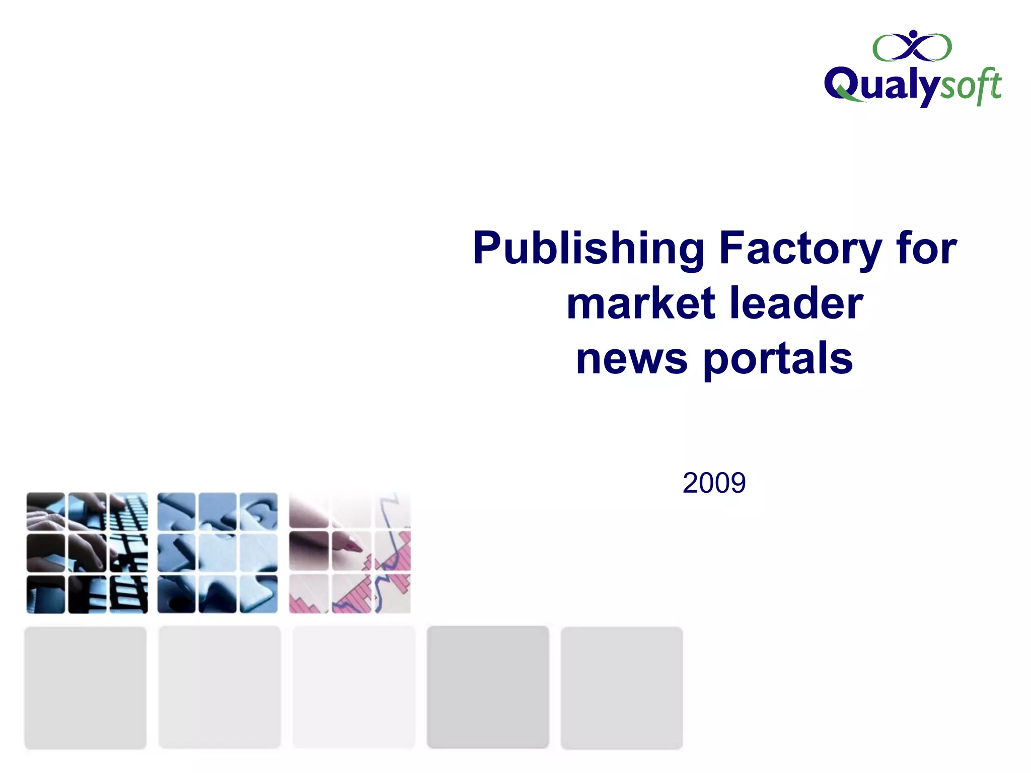 The document discusses services provided by Qualysoft Informatikai Zrt. to help companies create and operate online news portals, including renting an editorial system, applying custom designs, hosting the portal, providing ongoing support, and consulting on online journalism. References are provided for several existing news portals built using their Publishing Factory solution. Pricing and feature details are presented for operating a news portal through their services.