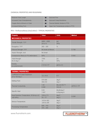 - PVDF (polyvinylidene fluoride) has high purity and strength, resisting solvents, acids, bases and heat. It is used where its lower melting point is advantageous for melt processing.