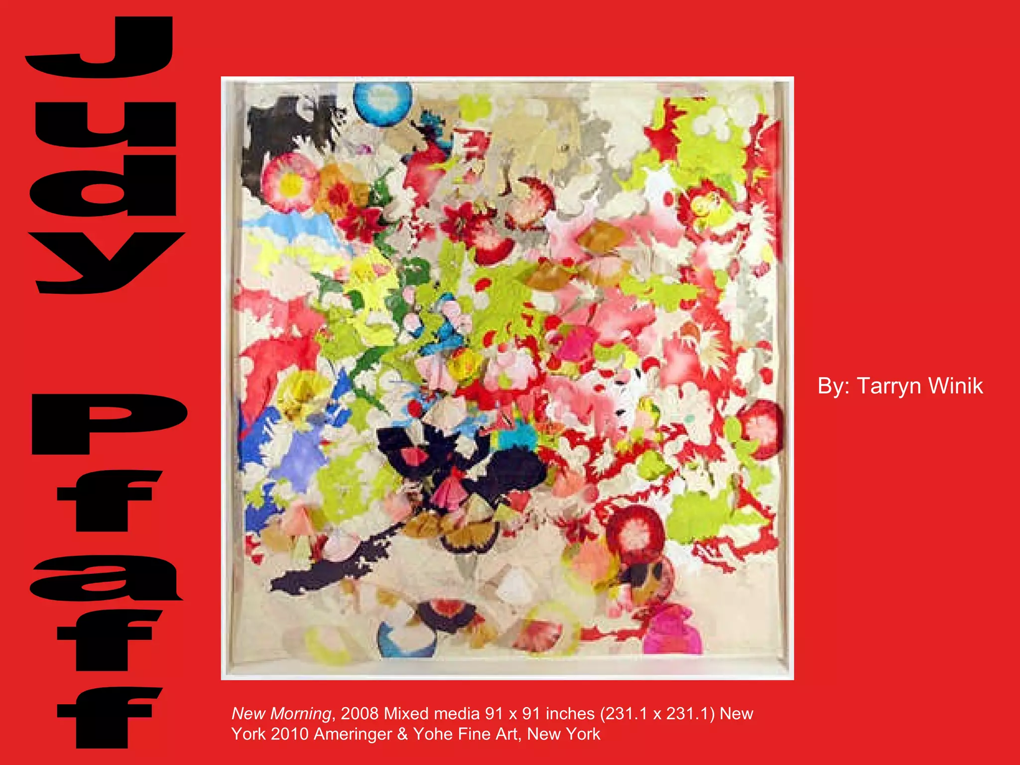 Judy Pfaff is an American artist born in 1946 who is known for her mixed media installations and sculptures. She draws inspiration from her studies of the 1960s and reactions of oil and water. Pfaff uses a variety of found and natural materials like paper, string, and flowers in her artwork to create a sense of movement and allow viewers to find their own meanings. Common colors used in her work include shades of grey, orange, and blue.