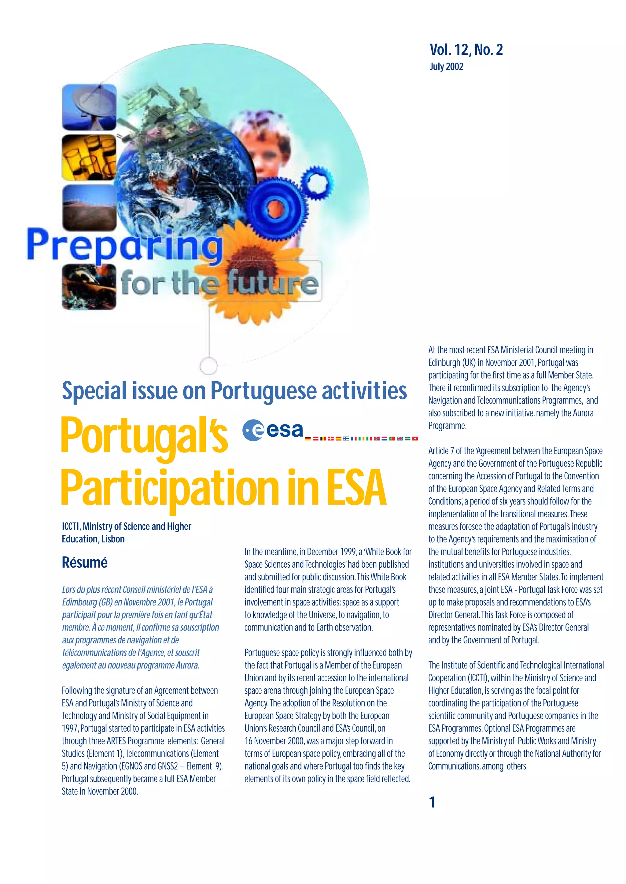 The document discusses Portugal's participation in the European Space Agency (ESA) as a full member, reaffirming its commitment to navigation and telecommunications programs while also focusing on the Aurora initiative. It emphasizes the need for Portuguese industries and scientific communities to adapt, with a task force created to align technological developments with ESA’s requirements. Additionally, it highlights ongoing projects, such as a microgravity experiment to enhance the food industry's techniques, and lays out future goals for utilizing space technology in various sectors within Portugal.