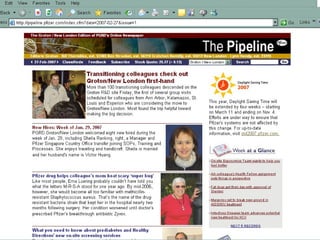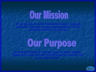 The document outlines Pfizer's vision, mission, values, and strategies. It discusses Pfizer's commitment to improving health and helping patients live longer lives through innovation. It also summarizes Pfizer's key values of integrity, respect, customer focus, community involvement, innovation, teamwork, performance, leadership, and quality.