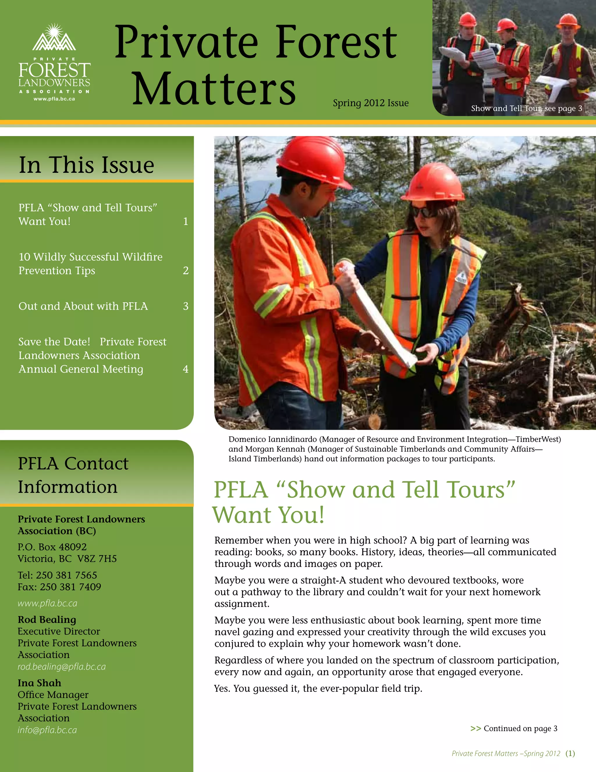 The document discusses the Spring 2012 issue of Private Forest Matters, highlighting the benefits of 'Show and Tell' tours organized by the Private Forest Landowners Association (PFLA) to educate participants on forest management. It includes wildfire prevention tips and promotes upcoming events such as their annual general meeting and a field tour focusing on sustainable forestry practices. Various communication tools and educational strategies are emphasized for fostering better understanding of private forest stewardship.