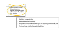 This document summarizes a presentation on project portfolio management. It discusses key aspects of PPM including strategy, governance, performance, risk management, and communication. It also references the Project Management Institute's standard for portfolio management as an important resource. The presentation aims to provide practical guidance on using data to make investment decisions and align projects, as well as optimizing performance through governance, risk management, and key performance indicators.