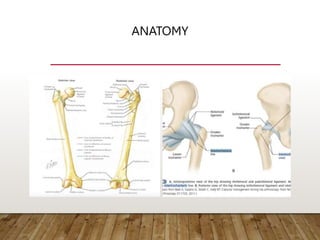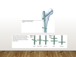 This document provides information on cephalomedullary nailing for hip fractures. It begins with discussing the anatomy and mechanisms of injury for hip fractures. It then covers classification systems for hip fractures, considerations for surgical treatment, and techniques for cephalomedullary nailing. Key steps discussed include preoperative planning, closed or open reduction, determining nail length and diameter, guide wire insertion, reaming the medullary canal, inserting the nail, and performing proximal locking.